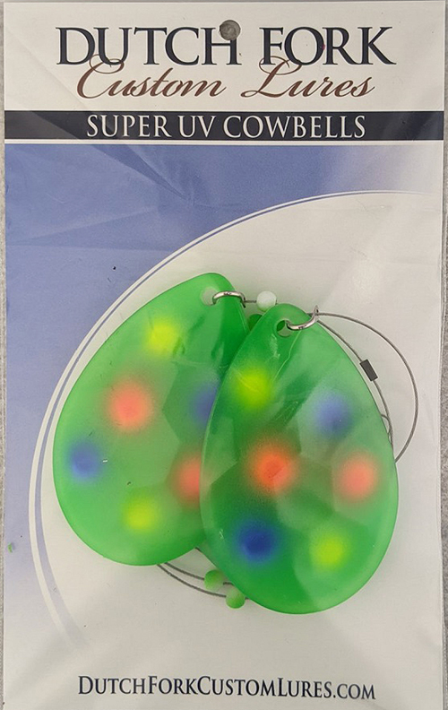 Our super lightweight cowbells have less drag than metal blades but still attract BIG lake trout and salmon. Run behind downriggers with our #2 Laker rig for some BIG fish action.